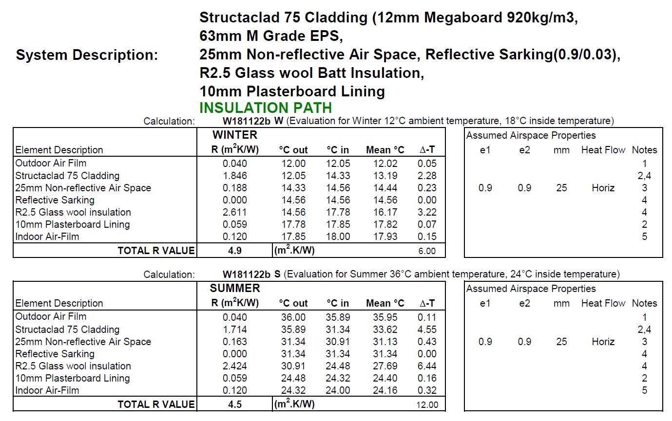 StructaClad has been independently assessed to achieve the following a total R Value of Rt (Summer) 2.8 m2K/W and Rt (Winter) 3 m2K/W. This is achieved without additional insulation in the framing. StructaClad Thermal Report